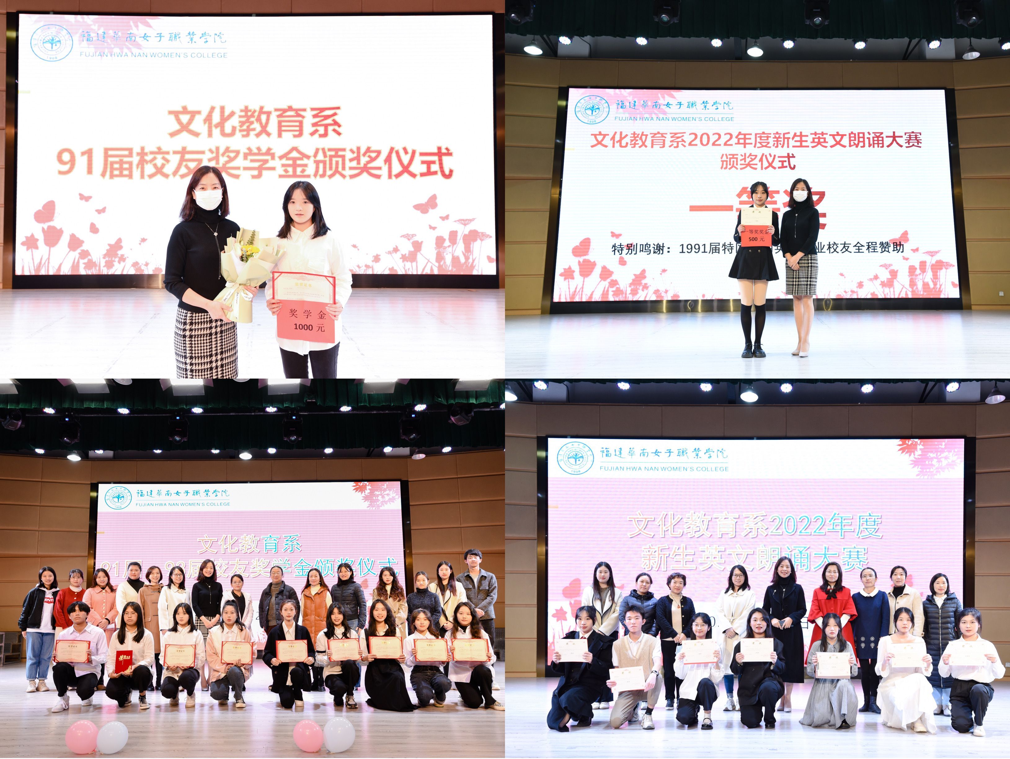 2022年12月7日下午,文化教育系在礼堂通过线上线下同步进行的方式开展91届、93届校友奖学金颁奖仪式暨2022年度“芳华流转 感恩有您”新生英文朗诵大赛。此次活动旨在感谢91届、93届校友长期以来对我系以及对历届学生们一如既往的关心和支持。