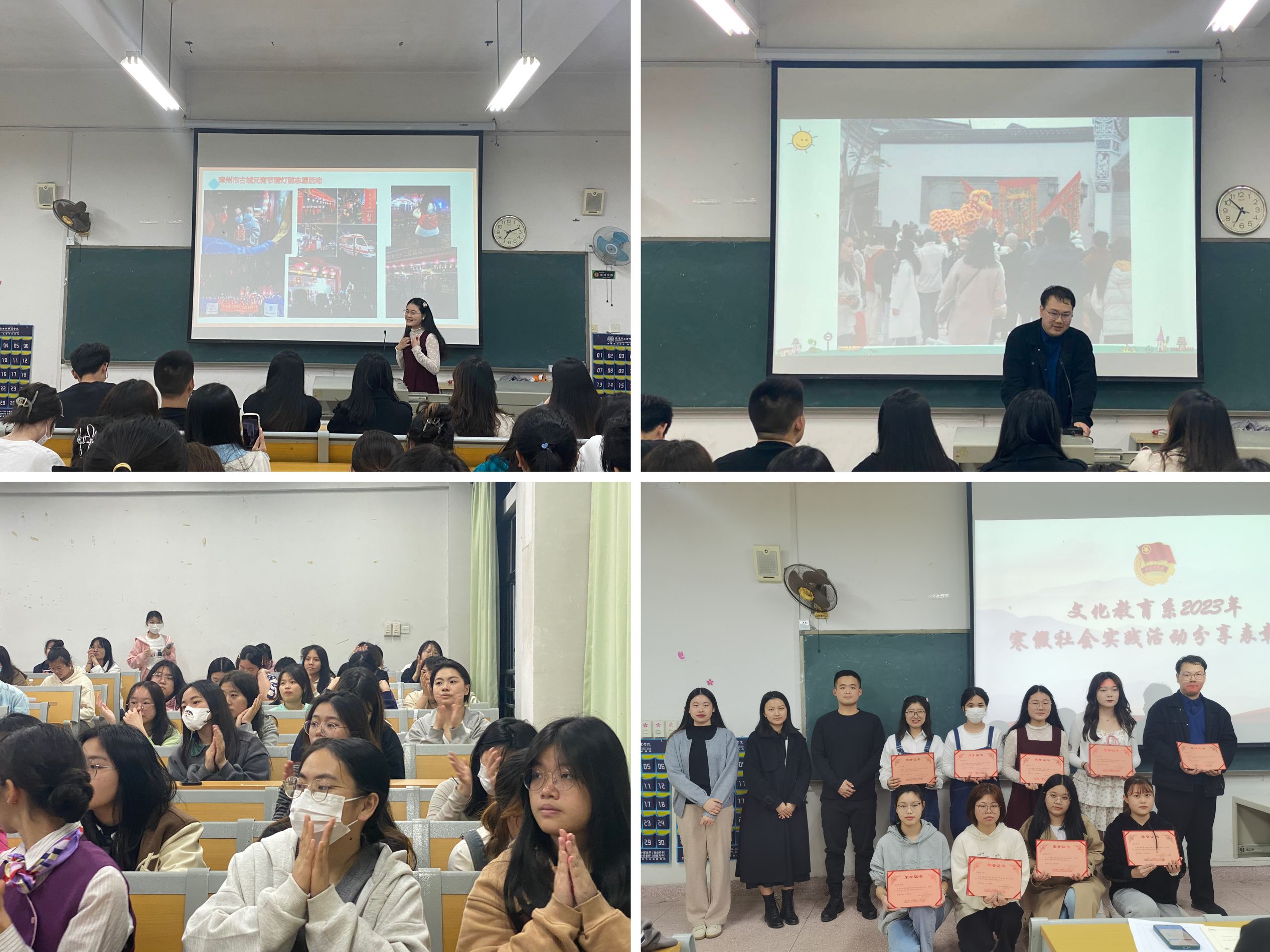 为深入学习贯彻党的二十大精神,引导青年学生领会“两个结合”深刻内涵,自觉践行社会主义核心价值观,帮助广大学生上好理论与现实相结合的“大思政课”。文化教育系团总支积极响应院团委号召,积极组织开展“我和我身边的中华优秀传统文化”主题社会实践活动,学生利用寒假,通过学术研究、调研考察、志愿服务等方式开展社会实践,探寻身边的中华优秀传统文化。为进一步分享总结,做好典型宣传、激励广泛参与、发挥育人实效,3月5日,我系开展“我和我身边的中华优秀传统文化”社会实践活动分享表彰活动,我系全体辅导员、学生代表150人参与此次活动。