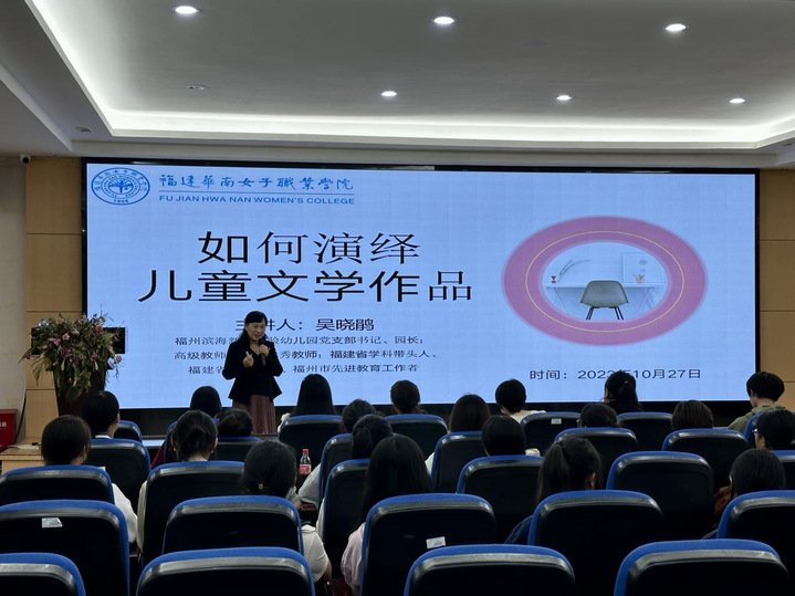 2023年10月27日,我系实训基地合作园---福州市滨海新城实验幼儿园园长吴晓鹃应邀来我校,作了题为《如何演绎儿童文学作品》的讲座。文化教育系老师、学生共同参与讲座与交流活动。