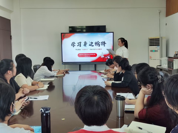 为深入学习贯彻习近平新时代中国特色社会主义思想,推动主题教育走深走实,进一步加强党员教师的思想建设,激励广大党员教师学先锋、担使命、善作为,应用英语党支部10月25日下午在学校综合楼六楼会议室开展主题教育“学习身边榜样”活动。