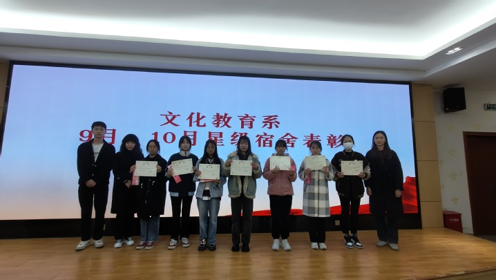 文化教育系高度重视文明宿舍创建工作,定期进行宿舍卫生检查并广泛宣传,每两个月对表现突出的宿舍进行一次评选表彰。综合9、10月卫生检查的结果以及宿舍成员整体表现情况,9、10月星级文明宿舍评选结果如下: