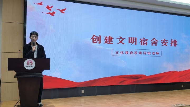 表彰大会上,黄诗镔老师对文明宿舍评分细则及星级宿舍评选标准进行了详细说明,他强调,学生寝室是大学生学习、生活的主要阵地,也是建立和谐人际关系的基础,良好的寝室文明氛围是大学生学习、生活的重要保障,今后应当维持良好的宿舍内务卫生,养成健康向上的生活习惯,共同打造星级宿舍。