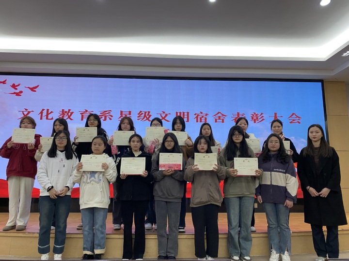 为了鼓励同学们积极参与星级文明宿舍创建,打造温馨舒适、文明和谐、健康向上的寝室环境,培养学生独立自主的能力,文化教育系在余宝笙报告厅举办2023-2024学年第一学期星级宿舍表彰大会,文化教育系党总支书记陈蕴玲、全体辅导员老师、舍长们出席表彰大会。