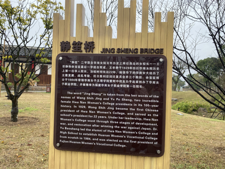 接着,来到静笙桥,它的名字是以华南女院历史上两位杰出女校长—王世静和余宝宝笙最后一字组合而成。外教请同学大声朗读,纠正发音,对照学习,中教对于华南历史进行详细解释,非常直观地进行了爱校荣校的教育。