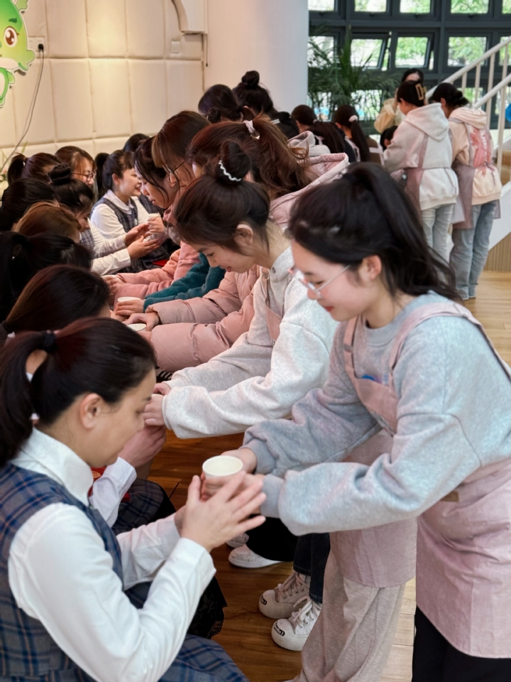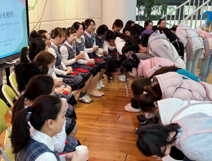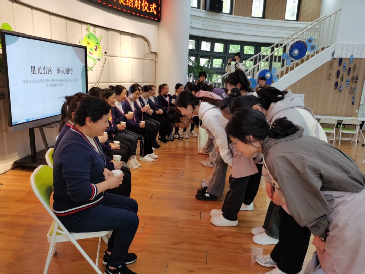 本次实训授予福州市新店中心幼儿园16位老师与保育员“实训指导师”称号。由本次参与实训的早教专业学生们对指导自己的师父行拜师礼敬茶鞠躬。
