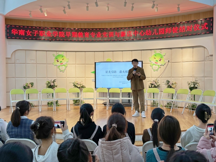 为优化人才培养实践教学环节,2024年3月21日,华南女子职业学院文化教育系早期教育专业与福州市新店中心幼儿园举办“实训师徒结对仪式”。共同探索早教专业人才培养的有效途径,为社会培养和造就更多应用型人才。尊师重教自古以来便是中国的优良传统,“弟子事师,敬同于父”,为进一步深化产教融合,加强校企合作,充分发挥园所优秀教师的“传、帮、带”示范和引领作用,帮助早期教育专业学生提高专业技能和职业素养,促进其全面发展,共同探索早教专业人才培养的有效途径,为社会培养和造就更多应用型人才。