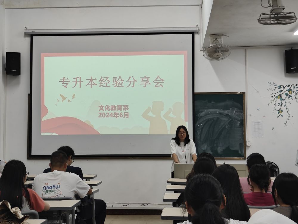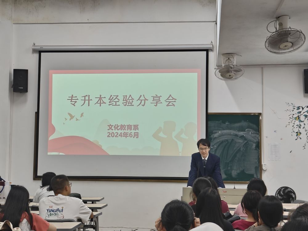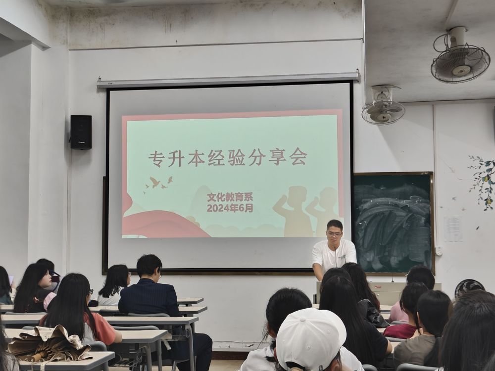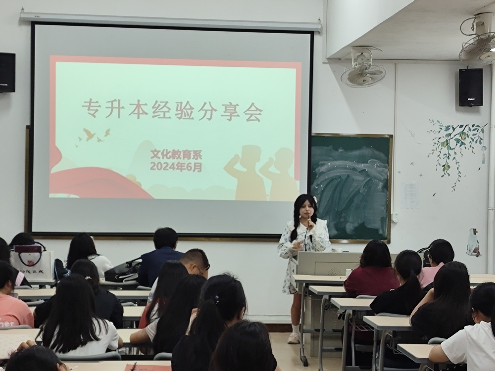 为进一步提高同学们对专升本的认识,增强信心,做好未来学习与规划,6月19日,文化教育系在培训楼101举办专升本经验分享会,文化教育系2022级、2023级有专升本考试意愿的同学积极参会,分享会由黄诗镔老师主持。