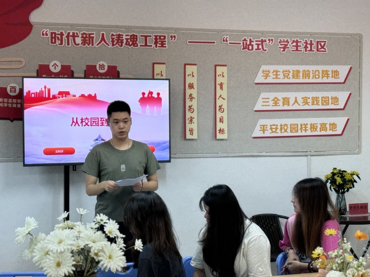 王科洋2023年9月退役后回到学校学前教育专业完成学业,刘航晟2024年2月退役退役后就读于应用英语专业。在分享会上,两位退役士兵从参军入伍到部队生活,再到退役返校,细致入微地分享了丰富多彩的军旅生活及心路历程,讲述了从一名普通的大学生到优秀军人的蜕变之旅,他们用切身经历向同学们分享了独特的青春之旅,鼓励同学们敢于挑战自我,勇于接受锻炼。在座的同学为这份爱国情怀所感动,纷纷表示要努力学习、做一个栋梁之材。