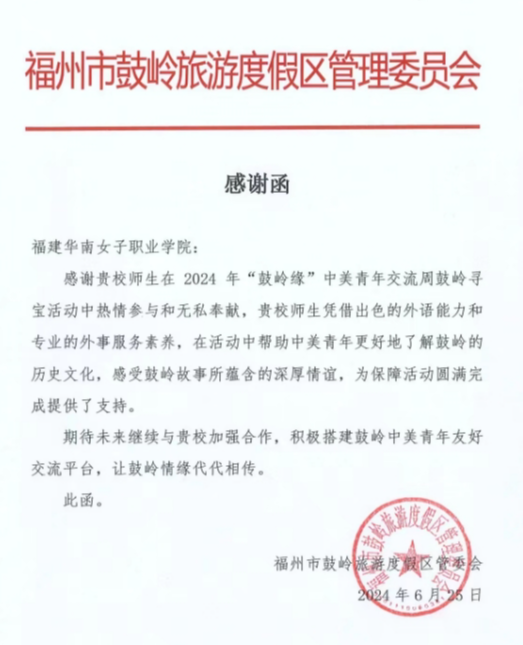 应英专业的师生志愿服务工作得到了鼓岭管委会的高度认可,特此发来感谢函。在未来,他们将继续践行“自强、开拓、勤朴、奉献”的校训精神,努力发挥英语专业优势,提升语言服务质量,积极投身各大国际活动的志愿服务岗位,践行责任担当,彰显时代精神。