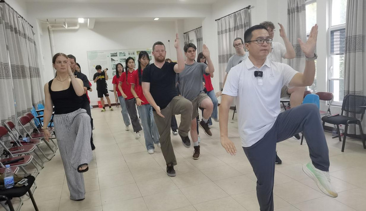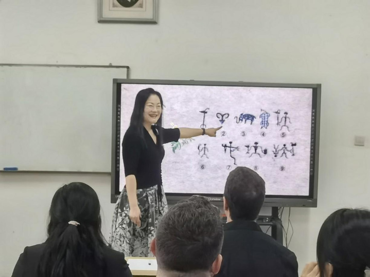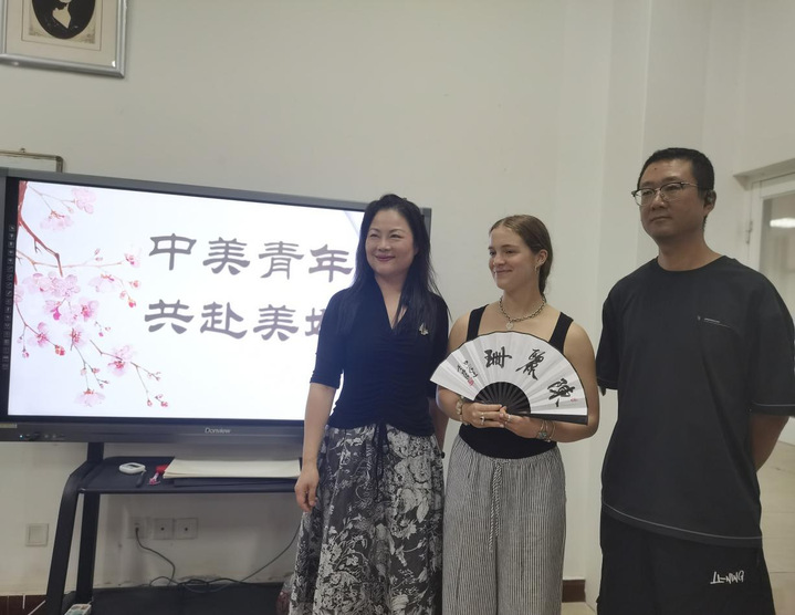 我院副院长黄磊晶教授给美国学生上了一堂生动有趣的中国文化课,让美国师生了解了中国汉字的发展演变,让他们感受到了中国文化的历史悠久和渊远流长。文化教育系李海滨老师向美国学生展示了他的墨宝,深受外国客人喜欢。基础部田中玉副教授从中国传统哲学思想和医学理论的角度介绍了太极拳的好处,并且简单教授了简版太极拳动作,引起了外国师生浓厚的兴趣。