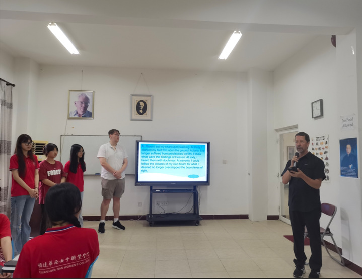 比赛结束,中美文化交流却渐入佳境,赖老师将华南学生和普吉湾师生分为三组,轮流抽取题库中的《论语》名言并进行解释。每一组可以从不同角度解释这些名言,也可以反驳其他小组的观点。观点无对错之分,旨在锻炼学生的思辨能力和英文表达能力,也让普吉湾师生更加理解《论语》中的哲学理念。有一组抽到题库中最长的一段内容,“吾十有五而志于学,三十而立,四十而不惑,五十而知天命,六十而耳顺,七十而从心所欲,不逾矩。”各小组表达了自己的理解之后,Stockdale 教授意犹未尽,分享了自己学到的另外一个译本,并以自己年近六十为例,着重分享了自己对这段话的理解。当他询问现场华南师生是否能熟练背诵出这段话的原文内容时,在场师生全部举手,一位学生迅速拿过话筒,熟练背诵, 令对方师生羡慕不已,惊叹中国有这么丰富的文化底蕴和中国学生得天独厚的文化学习条件。