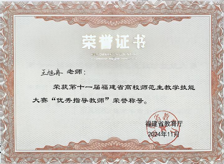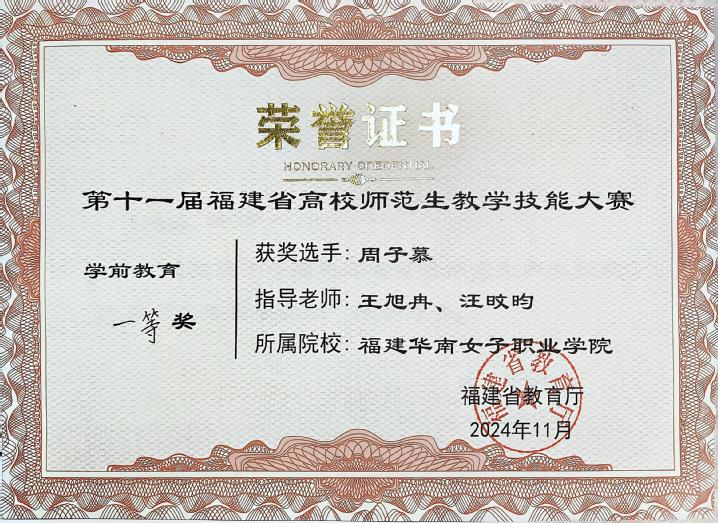 在场评委高度赞扬该选手的表现,这一成果的取得,既是周子慕同学个人不懈努力的结果,更是离不开我院学前教育团队的悉心指导与大力支持。专业带头人王旭冉老师以其深厚的教学功底与扎实的学术底蕴提供了宝贵的建议,帮助其在比赛中理清思路,冷静发挥。因而,王旭冉老师在本次比赛中荣获“优秀指导教师”荣誉称号。周子慕同学的成绩是我院学前教育专业团队协作与集体智慧的结晶。