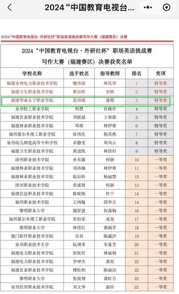 特等奖!!应用英语专业教师潘樱指导学生荣获 2024年外研社杯职场英语挑战赛写作大赛福建省赛区特等奖