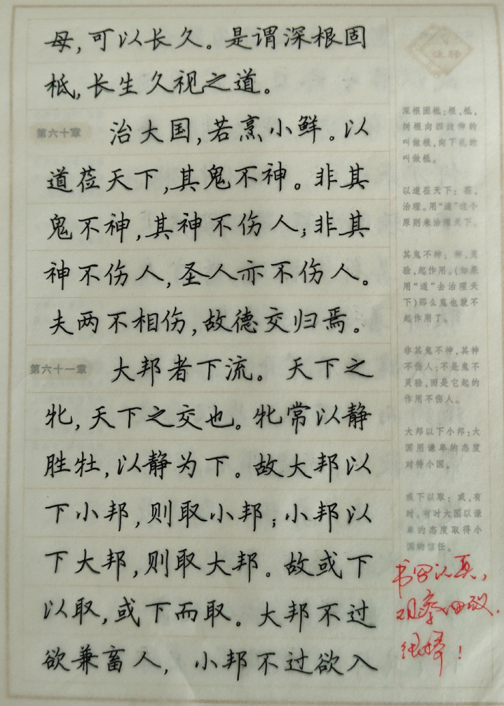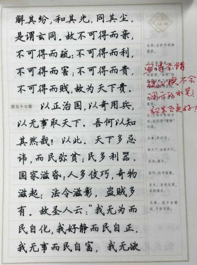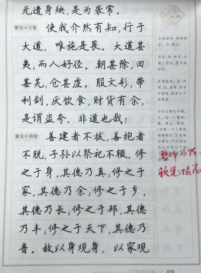 《道德经》字帖中的内容包含深刻哲理,如无为而治、上善若水等思想,书写过程可引导学生思考这些思想对社会治理、个人品德的意义,这是思政教育的一部分。通过笔锋书写,能让学生更深刻地体会其中蕴含的价值观,将传统文化价值观与现代思政教育融合,以文化人,促进学生形成正确的世界观、人生观和价值观。而且在书写时专注的状态,有助于思政教育中培养学生自律、自省等良好品质,这对早期教育专业学生的教师道德素养也颇有益处。