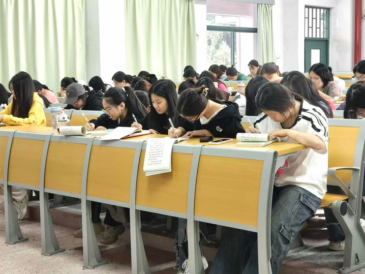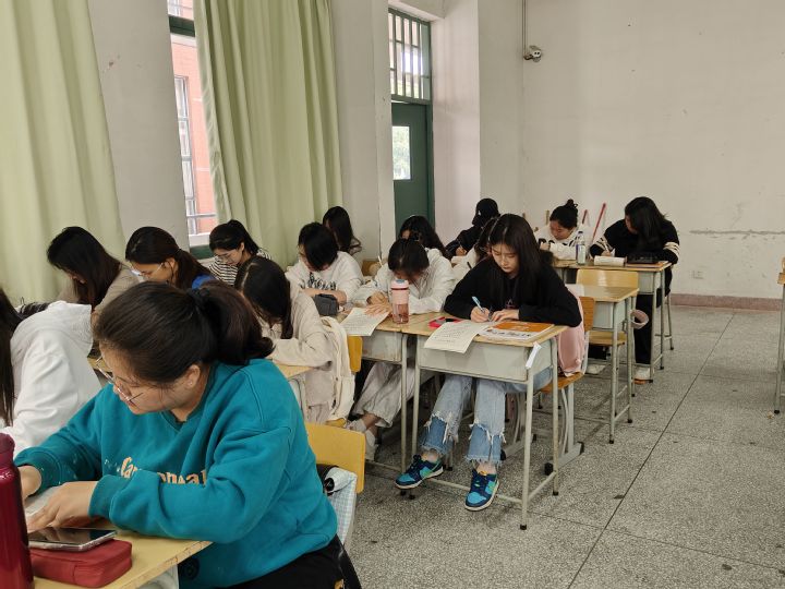 教室里一片安静,同学们正襟危坐,眼中透着专注。在思政思想的熏陶下,他们深知手中《道德经》字帖的分量。每一个同学都神情庄重,手握毛笔,笔尖轻触宣纸,一横一竖,一撇一捺,都写得极为认真。那一笔笔,仿佛不是简单的书写,而是在镌刻古老智慧与现代思政教育融合的印记。有的同学微微皱眉,全神贯注于笔画的起承转合,有的同学则在书写间隙稍作停顿,似在回味《道德经》字里行间蕴含的哲理,思政的光辉在他们专注的神情和认真书写的动作中闪耀。