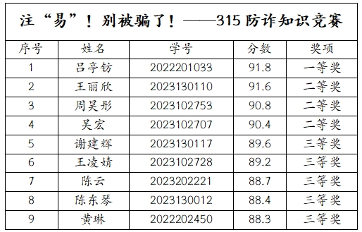 本次知识竞赛根据分数高低,最终评选出一等奖1名,二等奖3名,三等奖6名,恭喜以下9位同学。