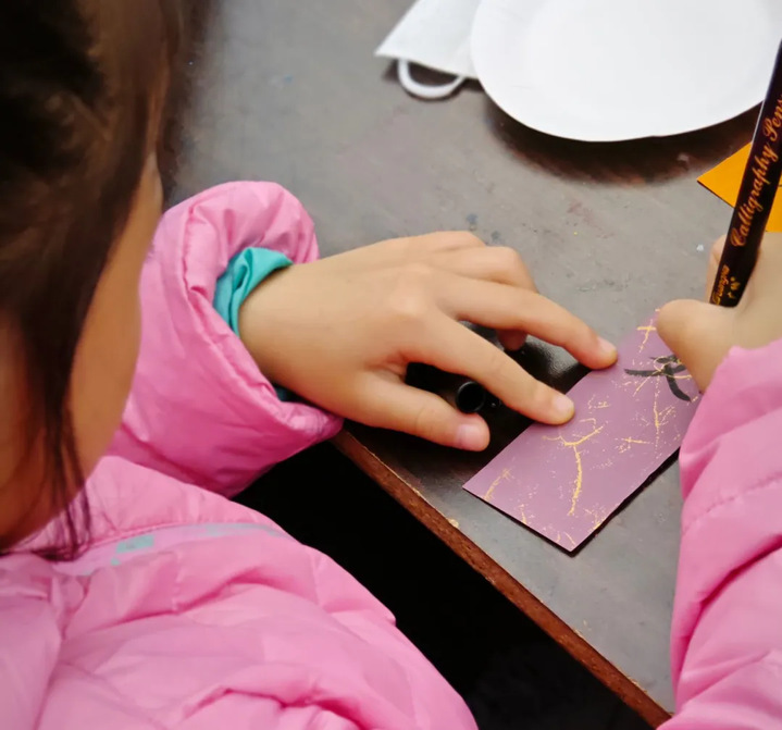 同学们将趣味手工体验和民俗文化传承相结合。天气虽然寒冷,但小朋友们都热情高涨,积极参与,乐在其中。纸盘贴画在孩子们的小手中变得五彩缤纷、各式各样,大家在动手操作和亲身体验中增加了对传统节日的喜爱之情。现场,文教学子还带领游客们书写出属于自己独一无二的“冬至”书签,以多样的方式留住美好时刻,传递冬日温情。