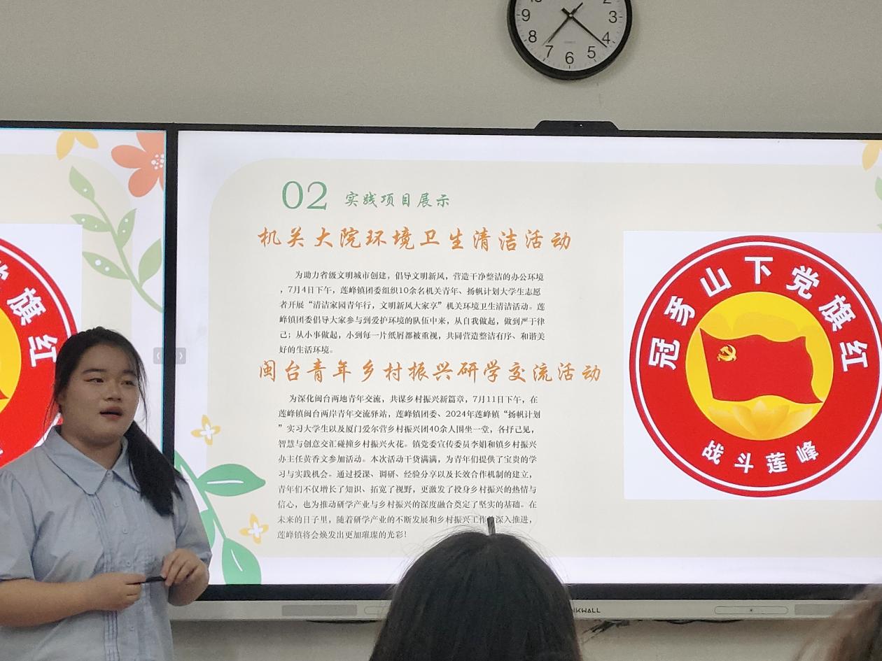 本次社会实践共收到我系百余名同学的实践材料,经过多重筛选,共评选22同学为“暑假社会实践先进个人”。五位获奖代表用精心制作的视频、PPT,围绕活动内容、实践过程、活动成果、实践心得等方面进行重点汇报总结,分享实践所得、所悟。汇报内容涵盖党政工作实习、爱心暑托班、美丽乡村振兴、图书馆管理志愿等多个方面,充分展现了我系学子深入基层、甘于吃苦、积极实践、奉献社会的新时代大学生形象。
