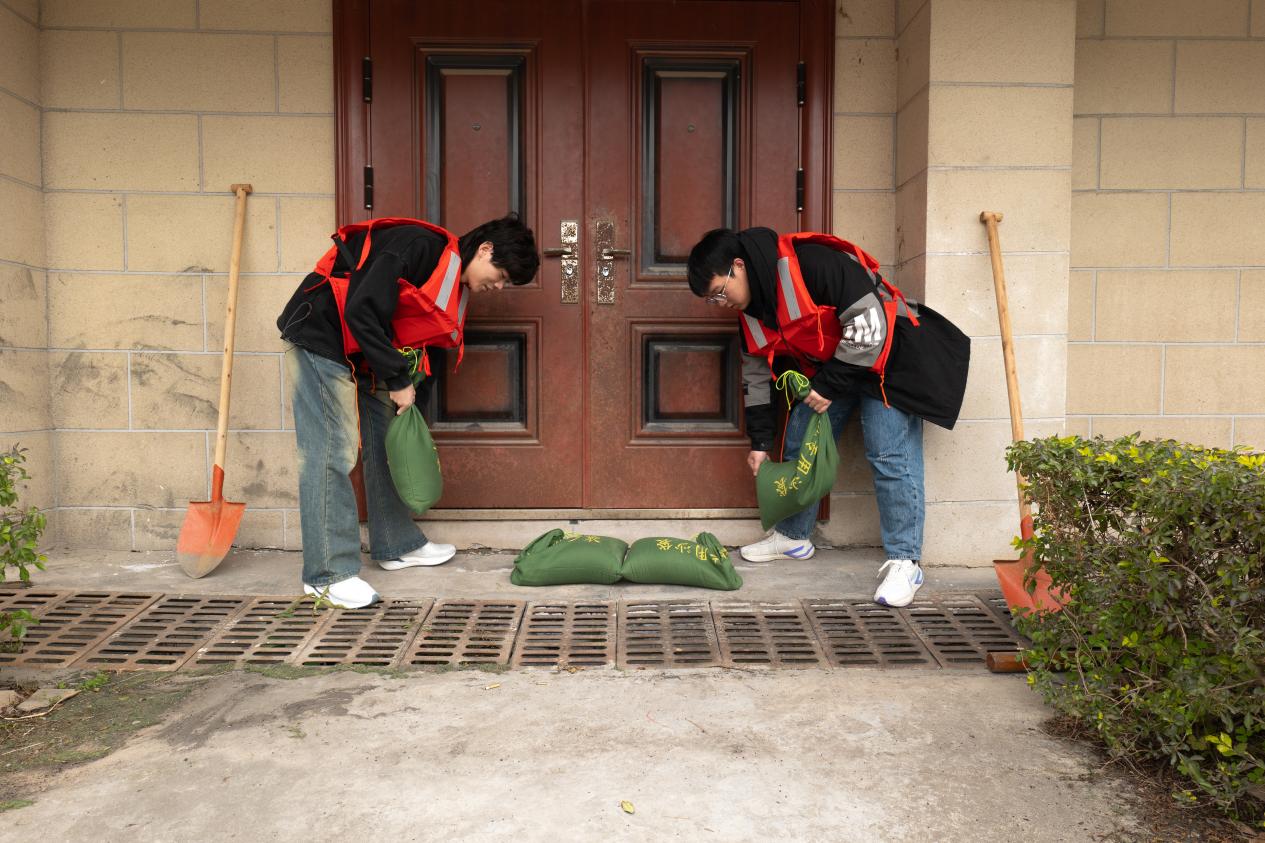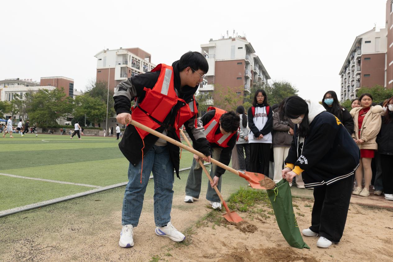 在撤离到操场后,模拟汛期的注意事项,组织学生穿救生衣、挖沙土、装沙袋,各项工作紧张有序的进行,每一袋沉甸甸的沙袋都满载着学生抗洪抢险的信心和决心。