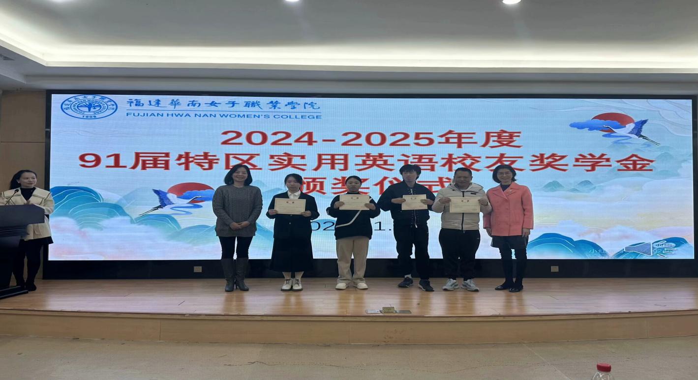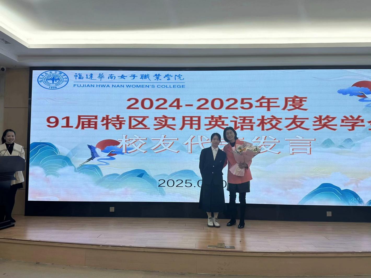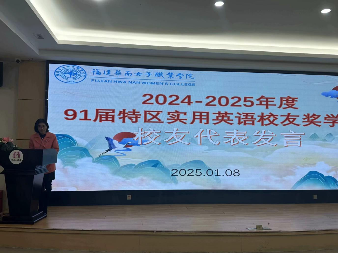 2025年1月8日上午,应用英语专业于学术报告厅面向2024级应用英语专业全体新生召开91届特区实用英语专业校友奖学金颁奖仪式。文化教育系党总支书记陈蕴玲、专业主任林小敏、91届特区实用英语专业校友代表董秀萍和陈相因、外教Cecilia Cobbs以及应用英语专业教师黄飞、叶林、严涵及乐荣妹等教师出席。