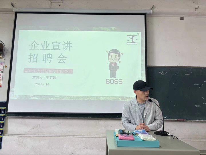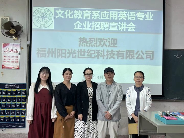 为深化校企合作,推进2025届毕业生就业工作,同时提升2023级学生就业意识,文化教育系应用英语专业于2025年4月16日下午13:30在3-102教室线上线下同步开展福州阳光世纪科技有限公司(简称阳光世纪科技)专场招聘宣讲会。应用英语专业主任林小敏、专业教师严涵组织活动,企业代表总经理王卫敏、办公室主任许秀萍、人事部经理何佩华出席了活动,王卫敏总经理任宣讲嘉宾。