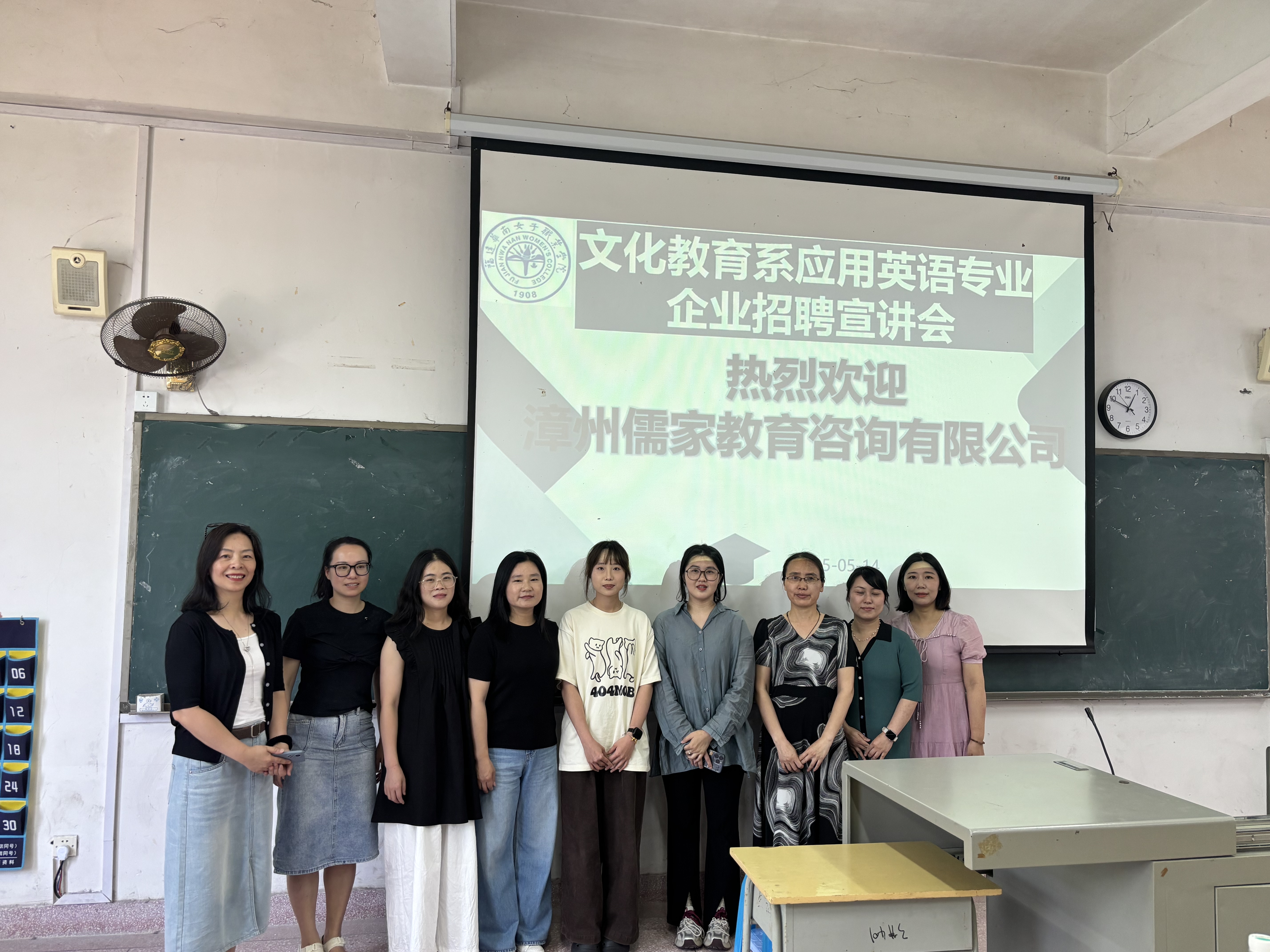 为深化校企合作,推进2025届毕业生就业工作,同时提升2023级学生就业意识,文化教育系应用英语专业于2025年5月14日下午12:30在3-202教室线上线下同步开展漳州儒家教育咨询有限公司(以下简称儒家教育)专场招聘宣讲会。应用英语专业主任林小敏出席并主持活动,专业教师董秀萍、严涵、张文君共同出席,出席的企业代表有儒家教育总经理何智慧、教务主任戴幼芬和许雯惠、校长助理柯鸿洁以及教务主任,何智慧总经理做宣讲嘉宾。