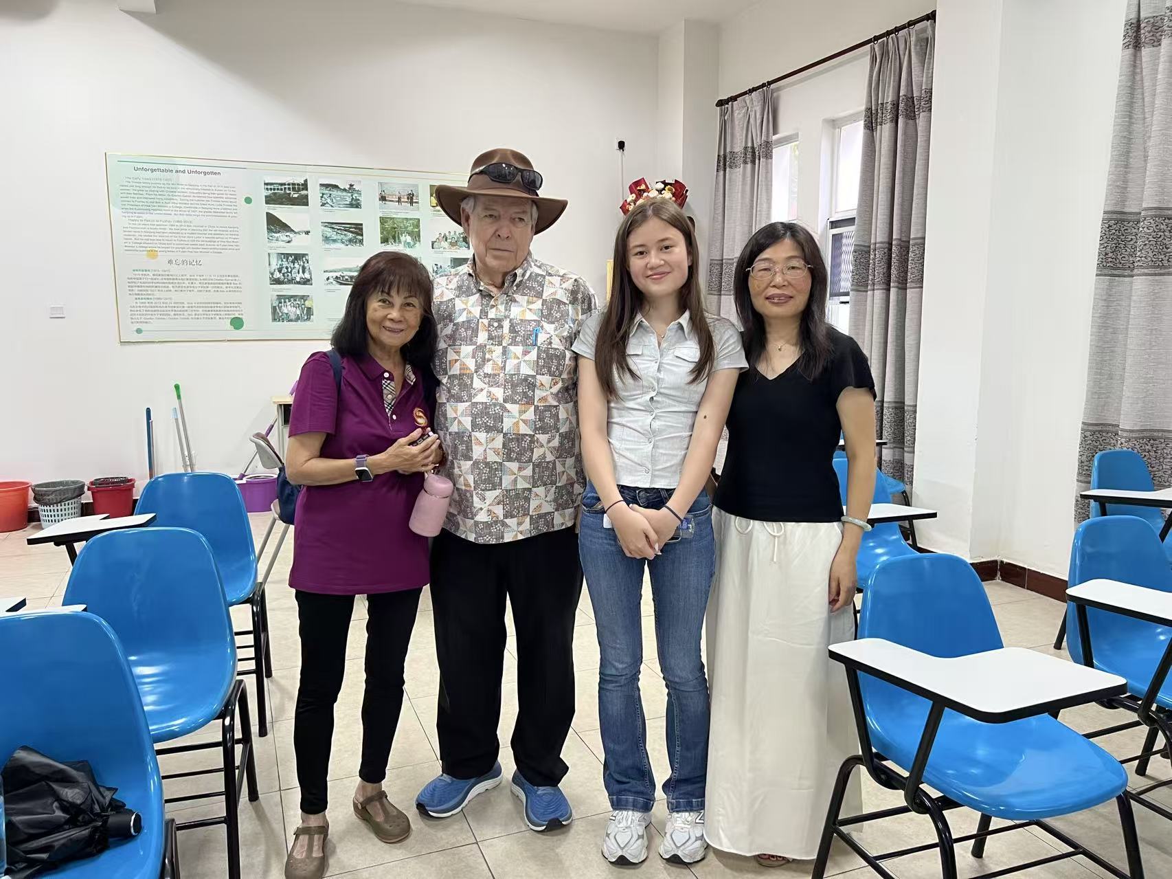 2025年9月23日,1991届特区实用英语专业校友何宗英、张江红重返母校,与外教Gordon Trimble、Sonia Trimble夫妇及在校师生齐聚一堂,共叙往日情谊,展望未来发展。