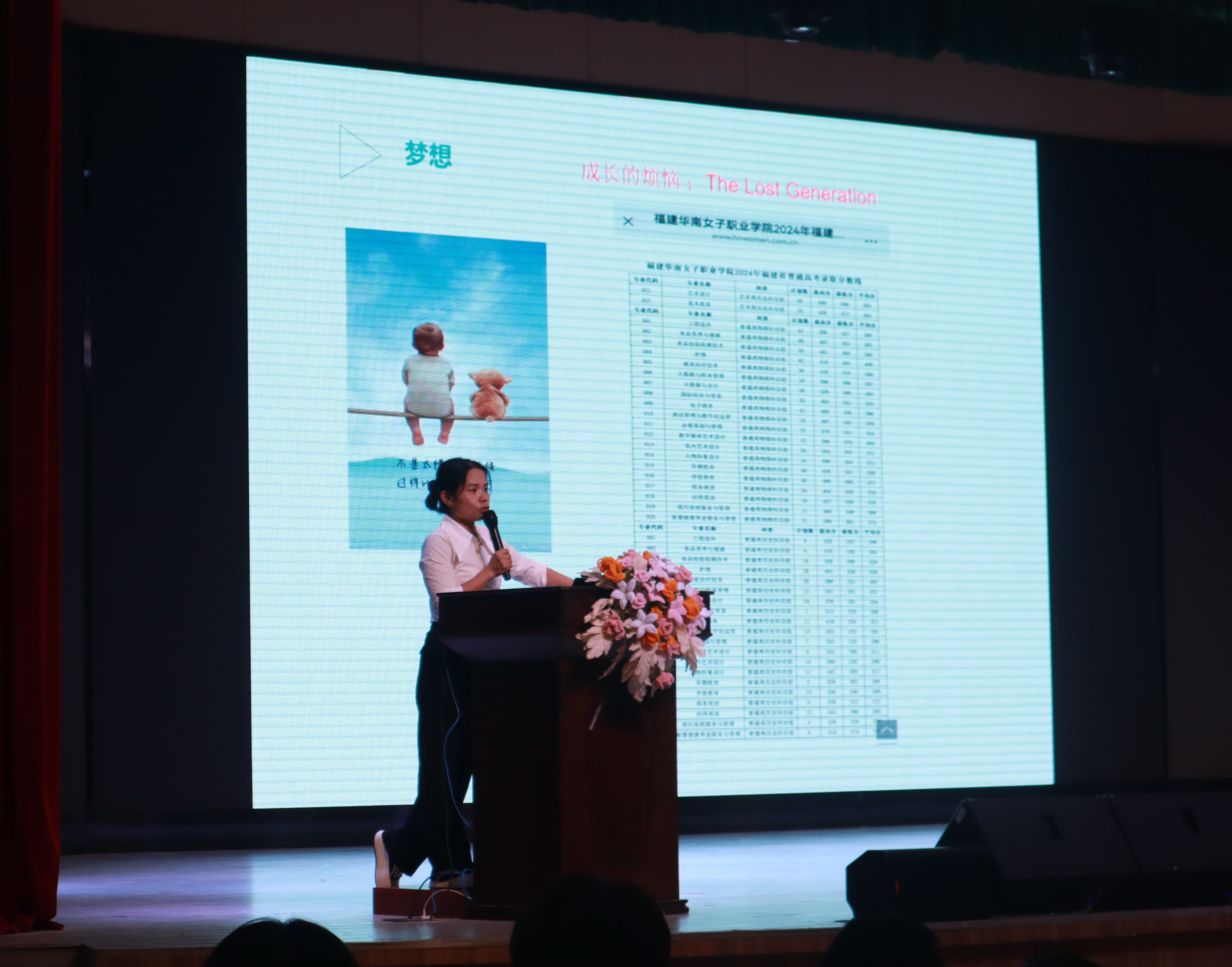 校友林影围绕华南校训精神,结合自身的成长经历,从“梦想、思想、理想”三个方面对新生们开展理想信念教育。