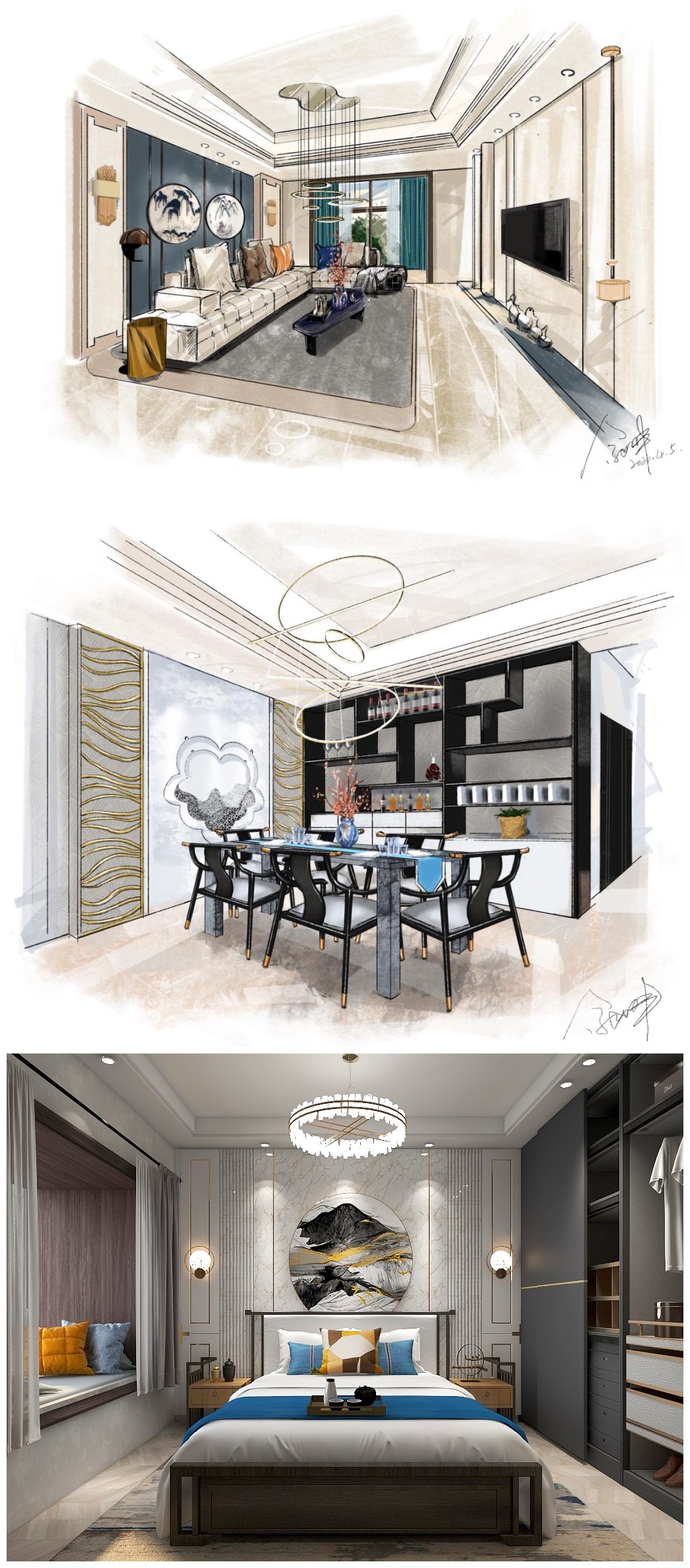 2020届在毕业设计命题中重视对“比例-空间-人”的归属感,同时作品表现形式和技法展现多元化,从软装角度展现全案设计的能力。品控方面在风格色彩基础上提高了对界面材质、家具尺寸、比例,环境的采光等细节表现。以下为本届学生部分优秀设计作品效果图。