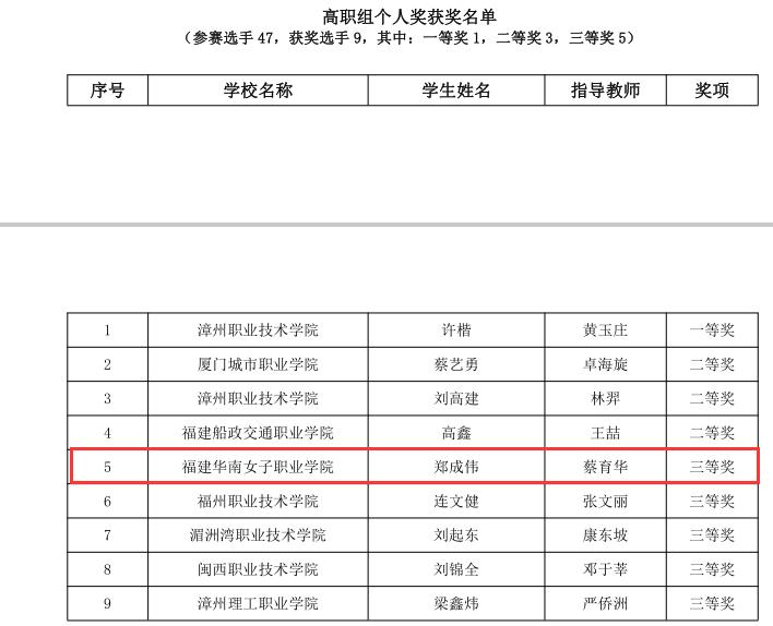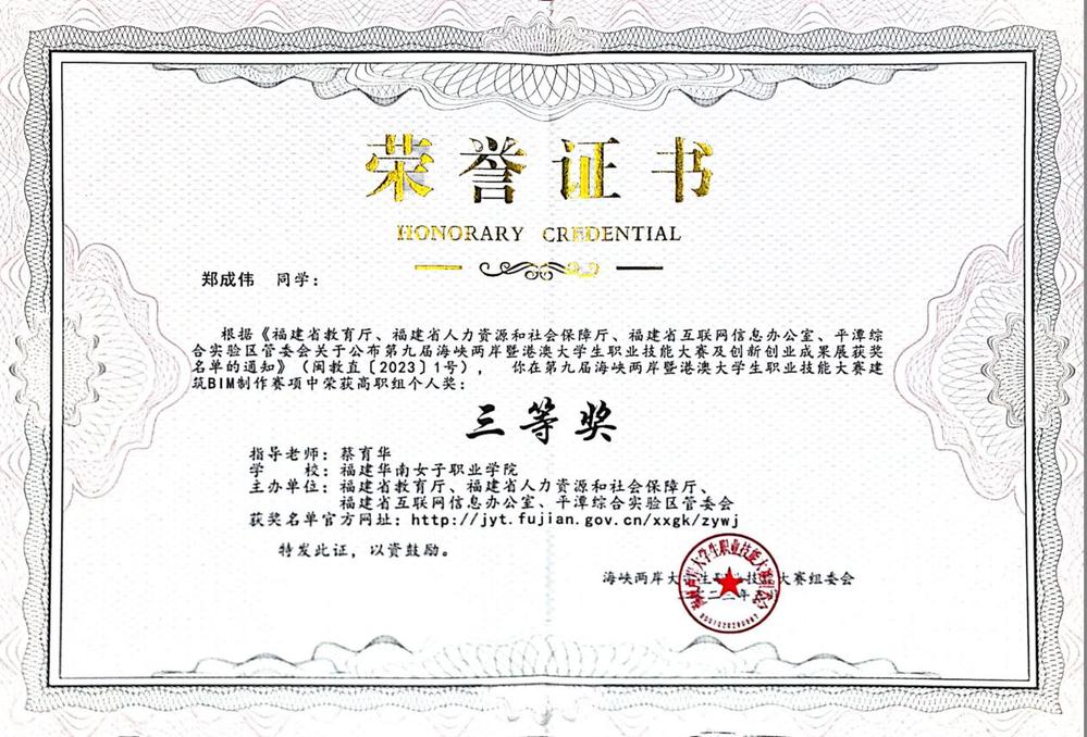 由福建省教育厅、福建省人力资源和社会保障厅、福建省互联网信息办公室、平潭综合实验区管委会等主办的第九届海峡两岸暨港澳大学生职业技能大赛建筑BIM制作赛项,历时2个多月,于2022年11月12日在福州经线上专家评审/答辩/实操落下帷幕,本次大赛有47个参赛选手,最终有9个选手获奖,我系2021级工程造价专业郑成伟同学(指导老师:蔡育华),成功夺得了“建筑BIM制作赛项”高职组决赛三等奖,这是福建省民办高职院校中取得最好的成绩。