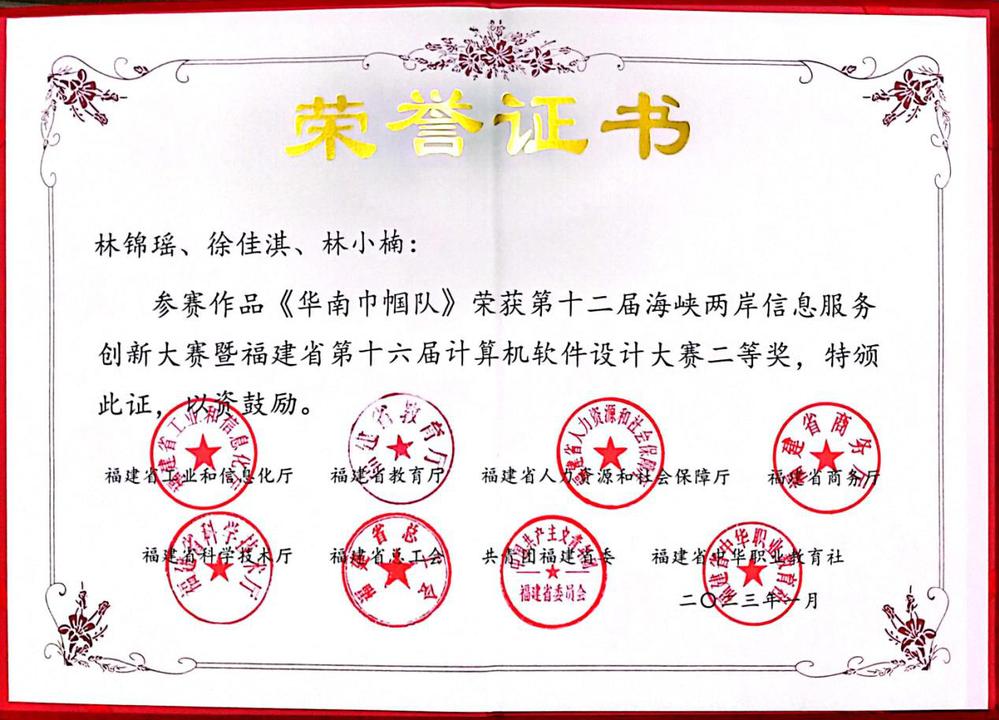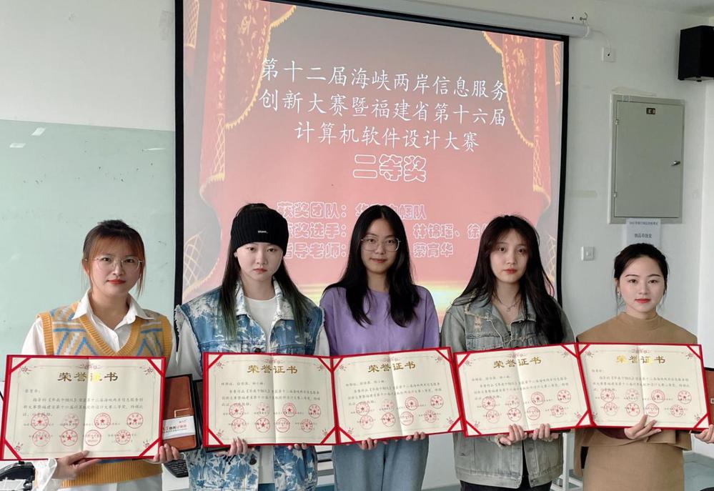 12月2日-12月4日,由福建省工业和信息化厅、福建省教育厅、福建省人力资源和社会保障厅、福建省商务厅、福建省科学技术厅、福建总工会、共青团福建省委、福建省中华职业教育社联合主办的第十二届海峡两岸信息服务创新大赛暨福建省第十六届计算机软件设计大赛总决赛成功举行。比赛自4月下旬启动以来,先后经过校内选拔、初赛、决赛层层遴选,我院艺术设计系工程造价专业陈秀珍、蔡育华老师带领学生林小楠、林锦瑶、徐佳淇组队创作的参赛作品《华南巾帼队》喜获本赛项二等奖!