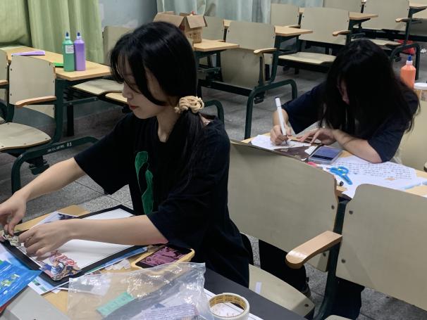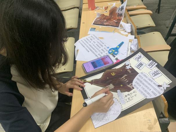 接着,同学们用画笔和剪刀绘制、拼贴红色电影海报、电影票。他们将电影中的经典场景、人物形象等元素巧妙地融入文创作品制作中,用艺术感悟红色精神,创作出了一个个富有红色文化内涵的作品。在创作过程中,同学们相互交流、学习,进一步激发了爱国热情和民族自豪感。