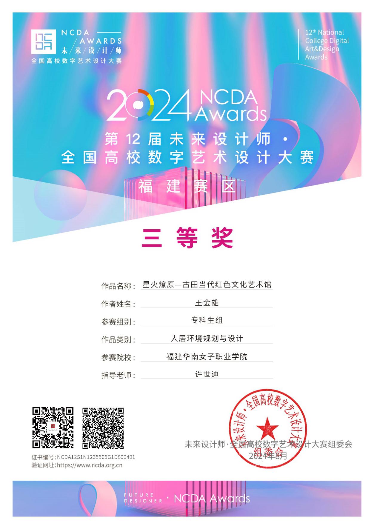 获悉,2024年“第12届未来设计师·全国高校数字艺术设计大赛(NCDA)”和“2024年中国包装创意设计大赛”,获奖名单公布,我校艺术设计系2022级室内艺术设计专业王金雄同学作品《星火燎原——古田当代红色文化艺术馆》荣获福建赛区三等奖、何龙涛同学作品《团聚——纸鸢椅凳》荣获非遗文化元素产品设计三等奖并入选“国家职业教育专业教学资源库”。