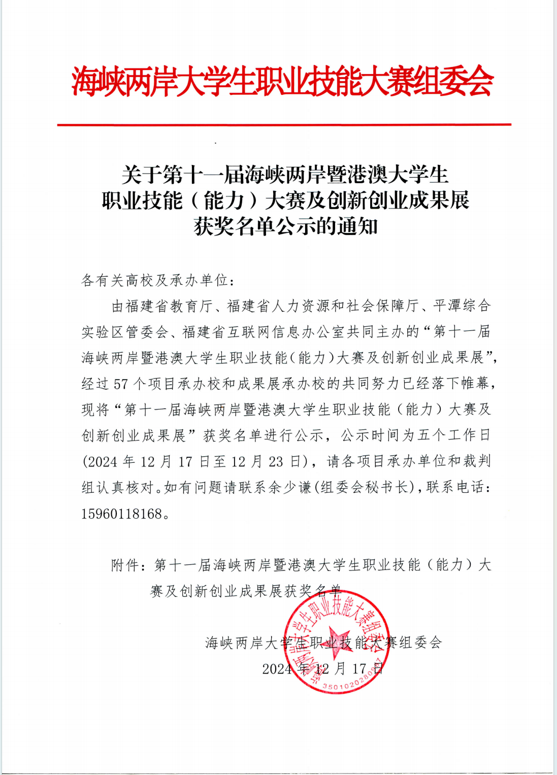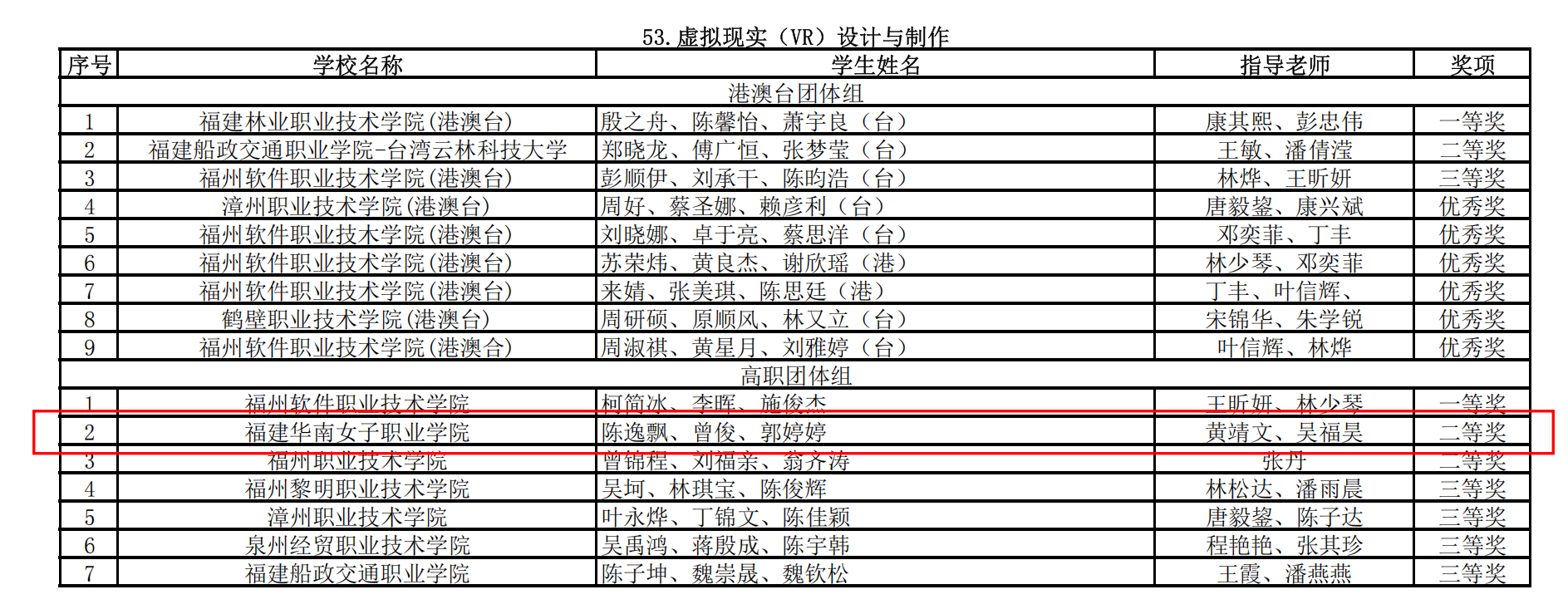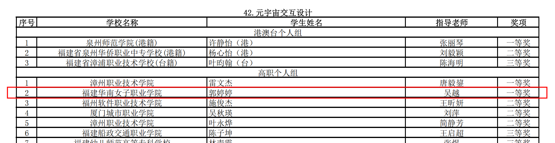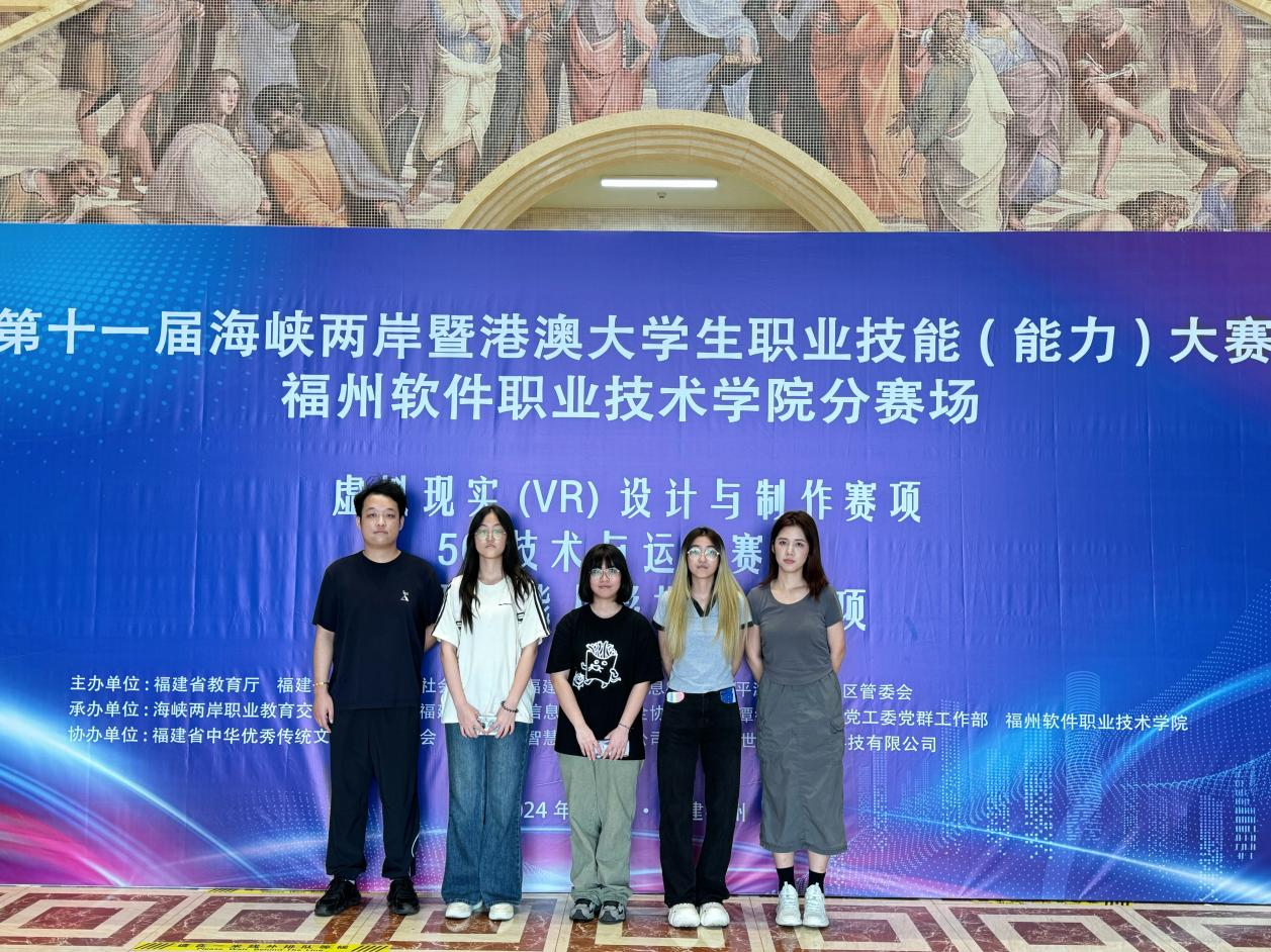 近日,由福建省教育厅、福建省人力资源和社会保障厅、福建省互联网信息办公室、平潭综合试验区管理委员会联合举办的第十一届海峡两岸暨港澳大学生职业技能大赛获奖结果公布,其中我校参赛的队伍中由艺术设计系吴越老师指导学生郭婷婷荣获元宇宙交互设计赛道一等奖;艺术设计系黄靖文、吴福昊老师指导学生郭婷婷、陈逸飘、曾俊荣获虚拟现实(VR)设计与制作赛道二等奖。