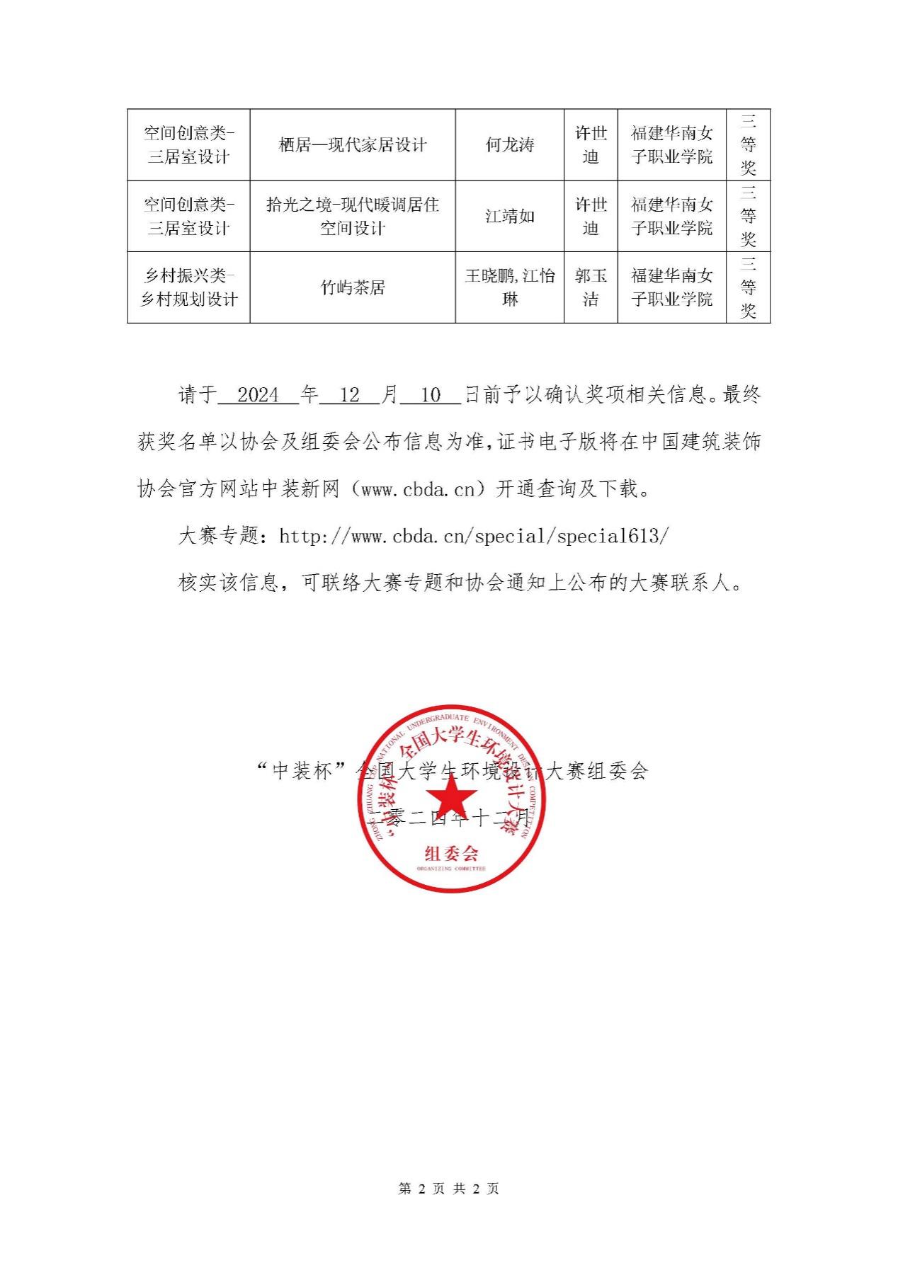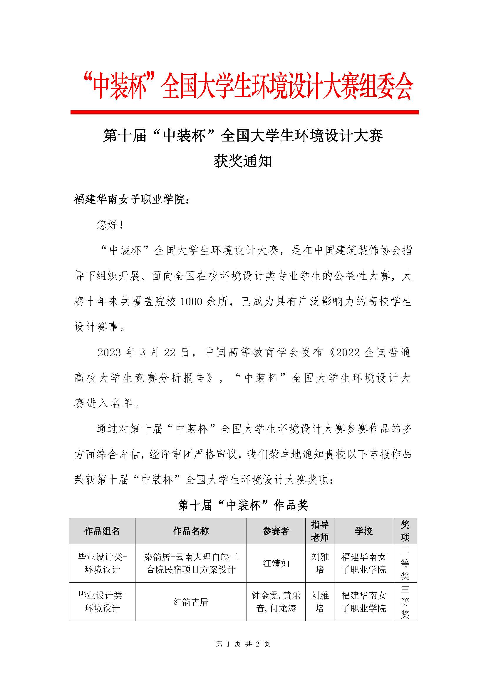 近日,中国建筑装饰协会主办的第十届“中装杯”全国大学生环境设计大赛评审结果公布,我校艺术设计学院室内艺术设计专业学生:江靖如的作品《染韵居-云南大理白族三合院民宿项目方案设计》、钟金雯,黄乐音,何龙涛的作品《红韵古厝》在毕业设计赛道分别荣获二等奖和三等奖各一项;何龙涛的作品《栖居——现代家居设计》、江靖如的作品《拾光之境-现代暖调居住空间设计》在空间创意赛道荣获三等奖两项;王晓鹏,江怡琳的作品《竹屿茶居》在乡村振兴赛道荣获三等奖一项。